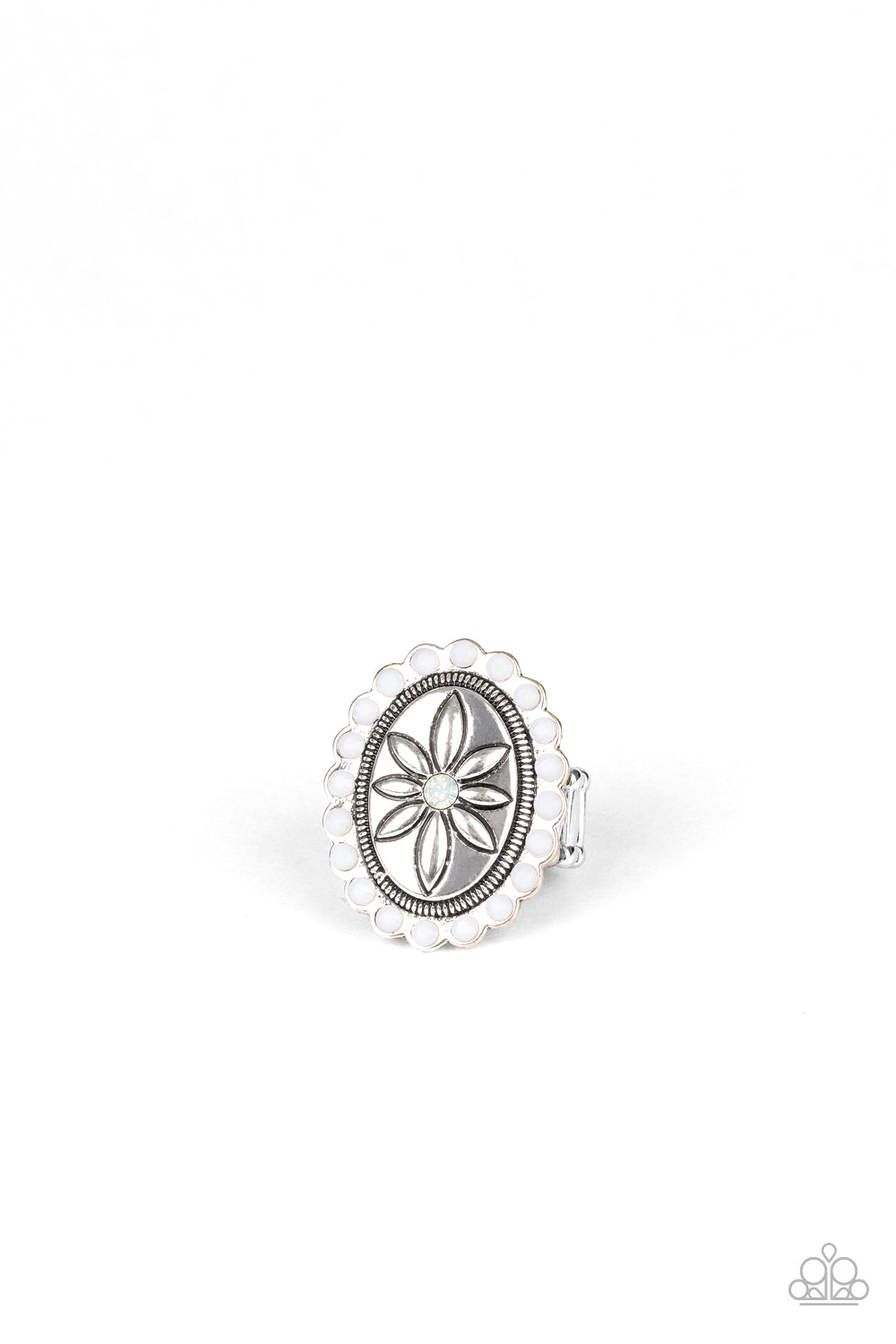 Featuring an opalescent rhinestone center, a stamped floral frame is bordered in a ring of dainty faceted white beads for a whimsical fashion. Features a stretchy band for a flexible fit.