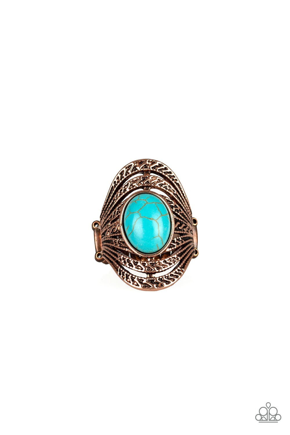 A refreshing turquoise stone is pressed into the center of layered copper bands radiating with tribal inspired textures for a seasonal look. Features a stretchy band for a flexible fit.