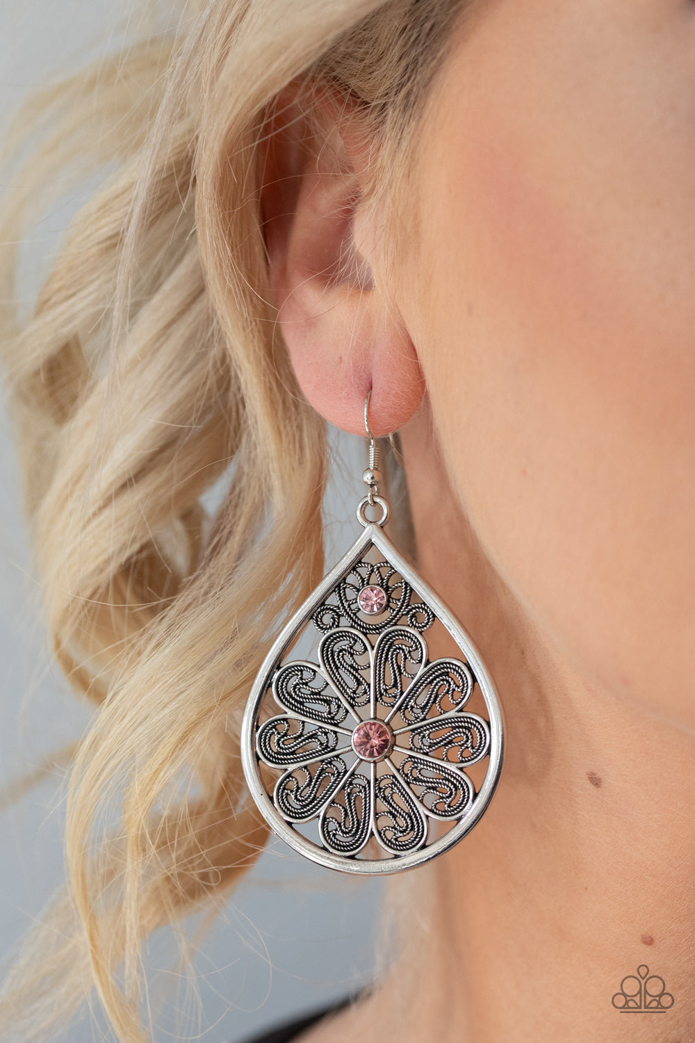 Dotted with two pink rhinestones, antiqued silver filigree swirls into a flowery teardrop frame for a whimsical look. Earring attaches to a standard fishhook fitting.